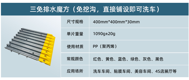 1、免挖溝,直接鋪設即可洗車。     2、免清淤,泥沙順自有排水溝直接排走。     3、免防水,接口處打防水膠后徹底防漏水。