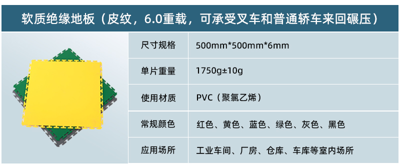 5、高承載,更防滑: 軟質絕緣地板為實心結構,只要地面承重沒有問題,其承載能力能夠達到每平米10噸以上。地板表面在生產過程中帶有凸起的紋路,讓車間地面更為防滑。