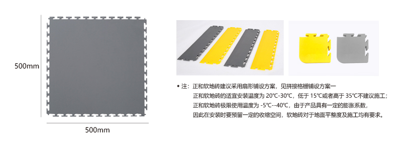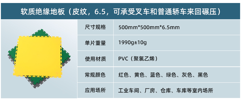 軟質絕緣地板能夠將每個獨立的地板快速拼裝成整體地面,專利型鎖扣結構連接能力更強,可承受叉車的來回碾壓。施工過程中無需膠黏劑等材質,具有施工簡單快速、色彩絢麗、美觀大方、可移動性強、可重復使用等特點。