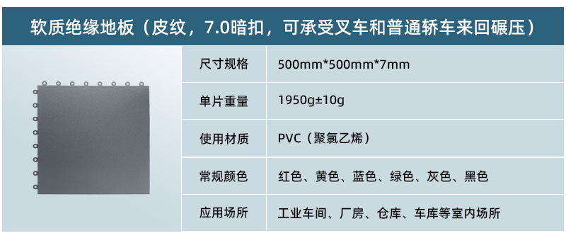 軟質(zhì)絕緣地板采用純新軟性PVC(聚氯乙烯)生產(chǎn)而成,具有防滑、防油、靜音、抗沖擊、高承載等特點(diǎn),可以快捷安裝在任何現(xiàn)有的基板,包括木材,混凝土,環(huán)氧樹脂,瓷磚,水磨石等,廣泛應(yīng)用于車間廠房地面、倉庫地面、車庫地面、健身房、展廳等場所。